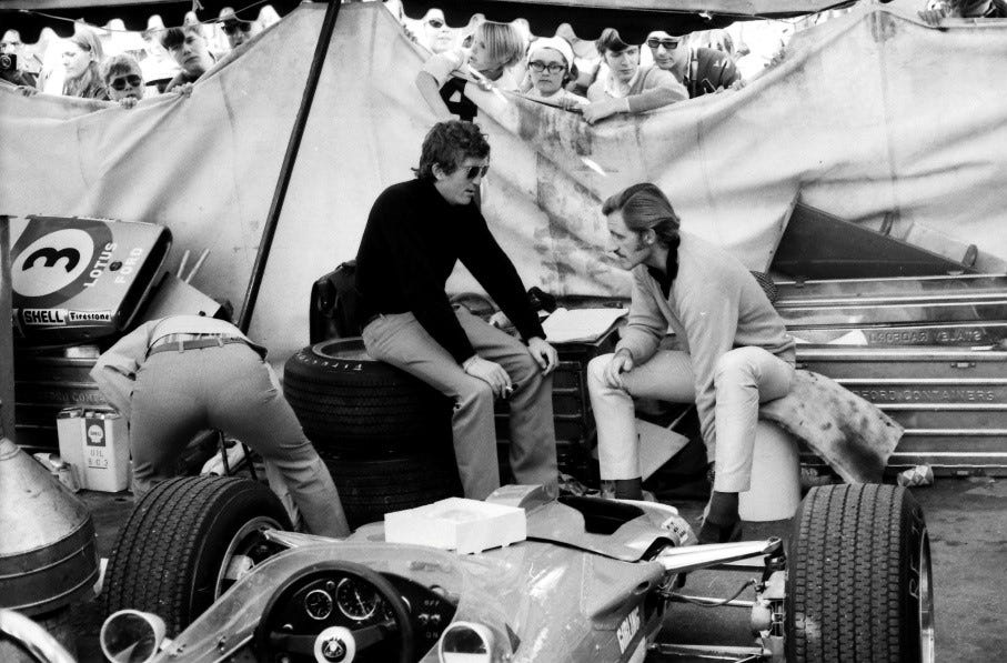 [to clarify: the photo in the tent shows Lotus teammates Jochen Rindt (l) and Graham Hill (r) conversing while Colin Chapman may or may not complete the rest of the butt on the far left!]